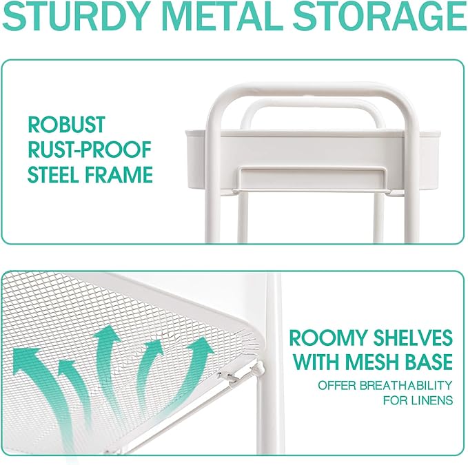 - Spacious & Versatile Storage: Each shelf holds 44 lbs! Use this rolling utility cart as a bathroom storage cart for towels, a craft organizer cart, or a mobile pantry. Mesh shelves add breathability for linens, toys, or damp items. Fits seamlessly in closets, dorms, or garages.