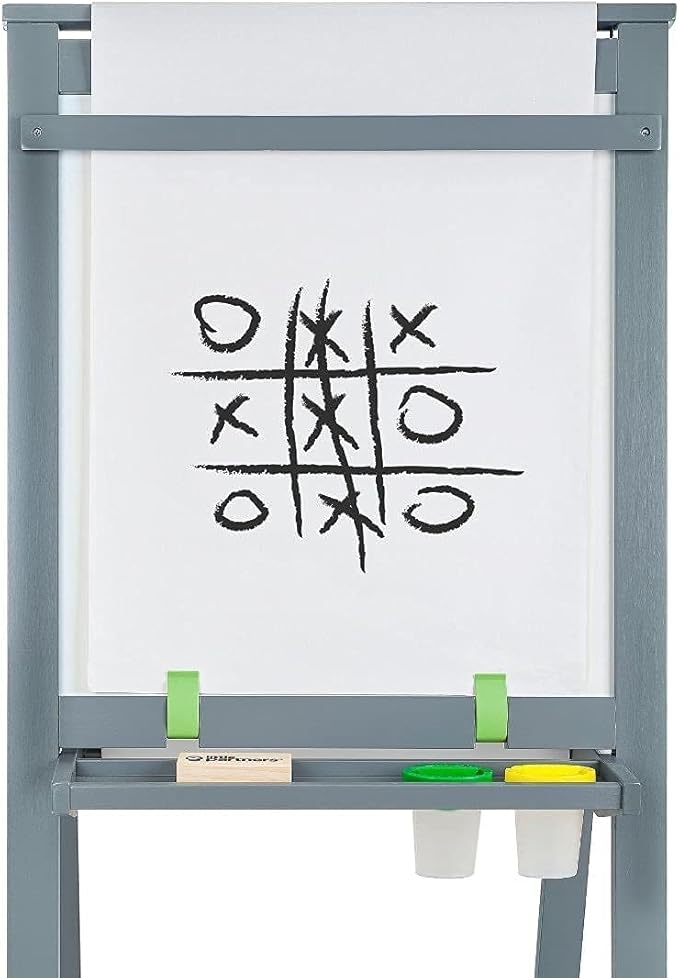 - Foldable Easel: Our 2-sided toddlers painting easel folds completely flat for easy storage, and features a chalkboard, dry erase board, and a paper roll