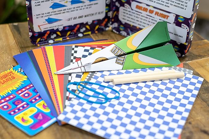 - INCLUDES: 20 paper airplane sheets, 20 stabilizer hooks, and 2 wooden rubber band sling shots