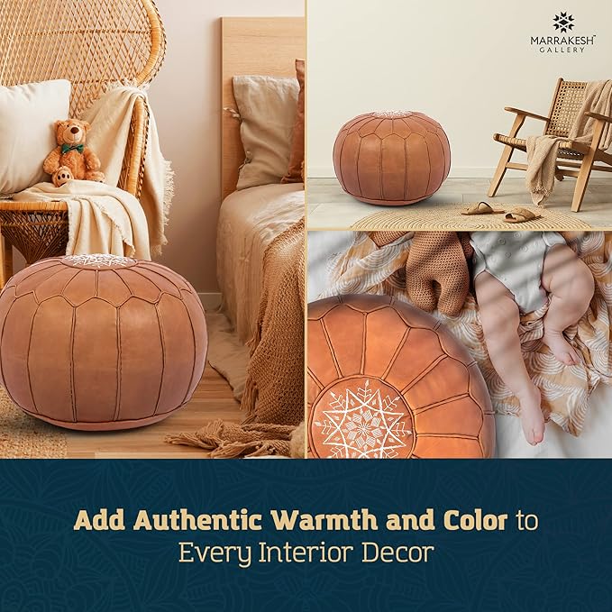 - Handcrafted by Artisans in Marrakesh - Made from 100% genuine soft leather, this Round Leather Cover pouf ottoman features exquisitely detailed, hand-stitched embroidery with a unique design down to the finest details