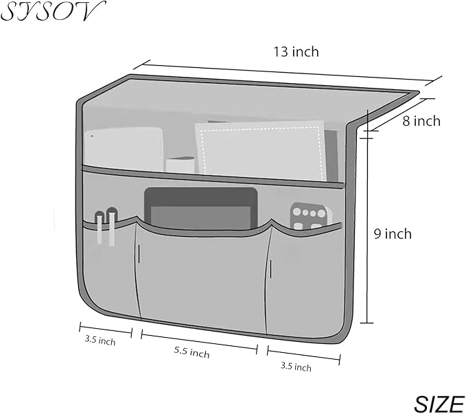 - </b> CREATE EXTRA STORAGE: </b>This bedside storage organizer has multiple pockets to keep items close at hand while you are relaxing in bed or on the couch, 3 small pockets for remotes, phones, glasses, and other small objects, 1 large pocket for books, notebooks, magazines, iPads, and other large objects.