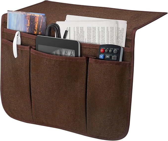 - </b> CREATE EXTRA STORAGE: </b>This bedside storage organizer has multiple pockets to keep items close at hand while you are relaxing in bed or on the couch, 3 small pockets for remotes, phones, glasses, and other small objects, 1 large pocket for books, notebooks, magazines, iPads, and other large objects.