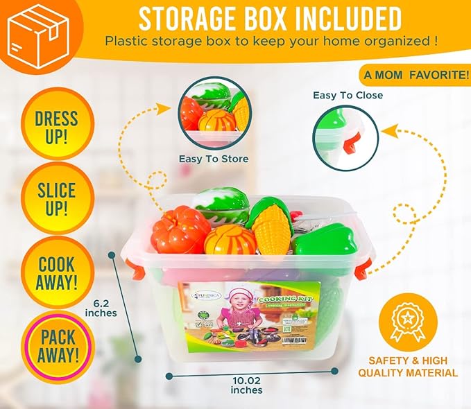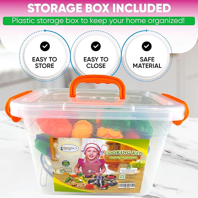 - ✅ CHEERFUL ORANGE STORAGE BOX – Keeping the pretend kitchen toys organized won't be a problem with our included storage container. This clear storage box with dual orange closures holds all the toy kitchen accessories neatly.