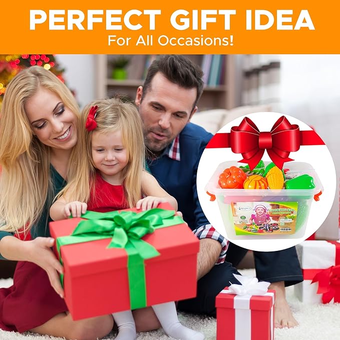 - ✅ DRESS UP AND SLICE - The included toddler apron and pretend chef hat complete the fun and imagination. The 20 pieces of toy cutting food toys, including an egg, vegetables, and fruits, look realistic - with larger sizes and vibrant colors. These fake food toy slices produce a fun crunchy sound when being cut.