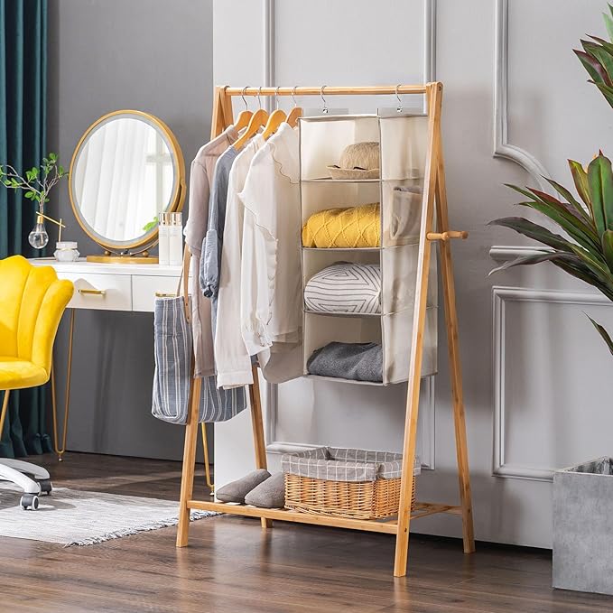 - 【High Quality】: Our hanging closet organizer is crafted from sturdy and thick non-woven fabric, ensuring long-lasting use. Unlike similar products, it features 2 sturdy bamboo sticks at each shelf and MDF board at the top and bottom, effectively preventing the compartments from bending.