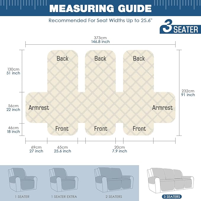 - 【DIMENSIONS GUIDE】 New colors and styles will make your furniture more unique and welcoming. 3 seater recliner cover fit a sofa with a seat width of 76.8 in, see measurement guide in photos. NOTE: Please confirm the size before purchasing