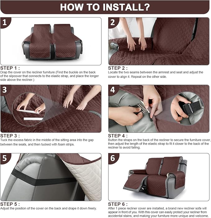 - 【REDUCE SLIP-OFF CONCEPT】 1.Solid round colloid design on the back of our recliner cover; 2.Additional flexible elastic straps and foam strips, 3.Two elastic straps on the bottom of the seat cover and matching buckles (only two)