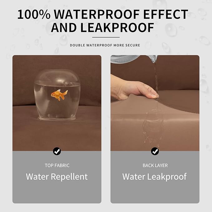 - 100% Waterproof Fabric: Top Fabric is processed with waterproof treatment, and back coated with waterproof layer. Dual waterproof feature can guarantee 100% waterproof effect and leakproof. elastane +polyester, back coated with TPU film. The couch cover is a great choice for homes with children and pets.