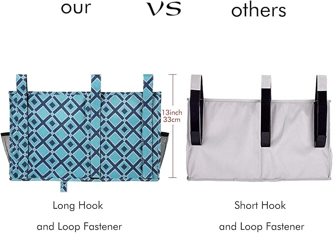 - Great Design: The hanging organizers have three adjustable heavy-duty hook and loop fastener belts that can be firmly fixed on the bed rail, and bed caddy organizers also can be hung stably on the head of the bed. The back of the bedside pocket with cardboard support is durable and can bear heavy weight. Easy to use, no assembly required.