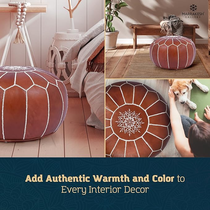 - Handcrafted by Artisans in Marrakesh - Made from 100% genuine soft leather, this Round Leather Cover pouf ottoman features exquisitely detailed, hand-stitched embroidery with a unique design down to the finest details