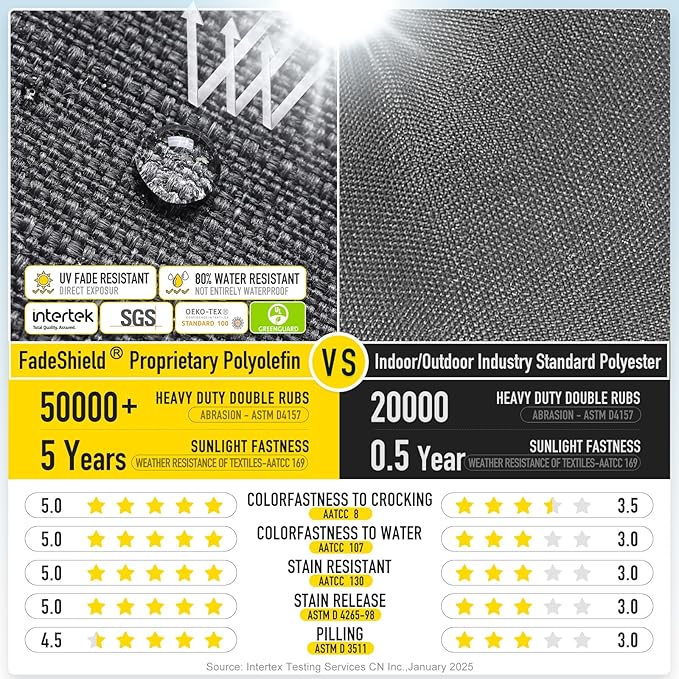 - 【FadeShield - UV Fade Resistant】FadeShield Proprietary Polyolefin are dependable indoor/outdoor performance fabrics, they are infused with antimiсrоbial silver Ion technology and can withstand 5 years of UV fade resistance, solution-dyed to make sure that each color is deeply ingrained in every fiber for continued vibrancy, even after heavy use. 80% water resistant (not entirely waterproof). We recommend bringing it indoors when it rains or when not in use to preserve its lifespan and keep it looking beautiful.