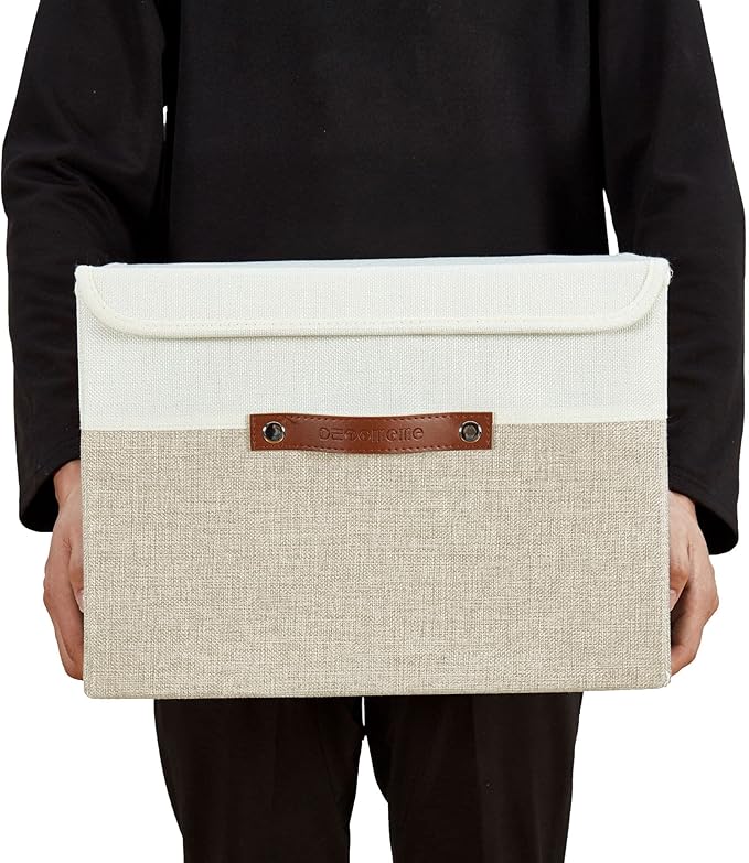 DECOMOMO Fabric Storage Bins with Lid, Storage Baskets for Shelves (Beige and White, 3 Pack)