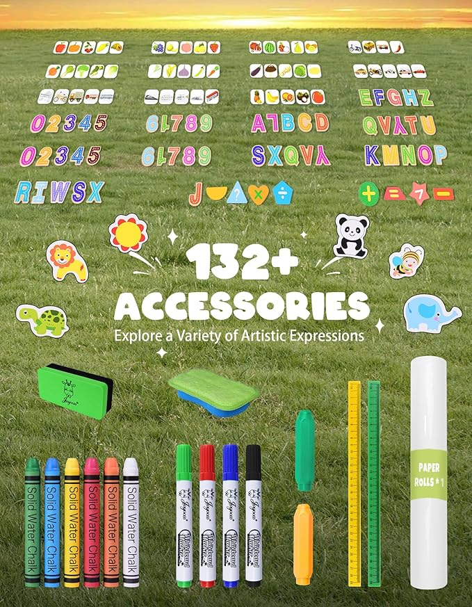 - ABUNDANT ACCESSORIES: Considering the kids painting activity, our kids easel for painting comes with a complete set drawing supplies, including 1 roll drawing paper, 2 magnetic rules, 4 drawing cups, 4 markers, 1 eraser, 1 box of dust free chalk, 2 chalk cases, 1 washable eraser, 1 set colorful magnetic letters, math etc