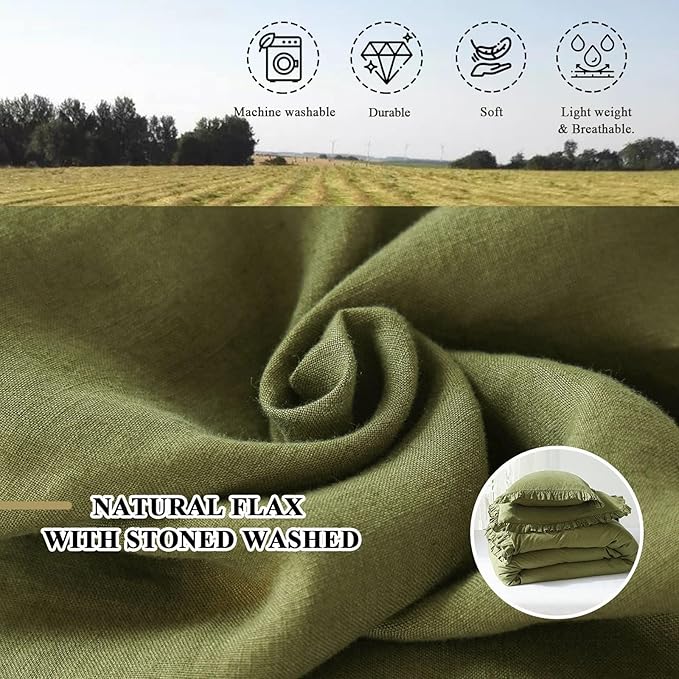 Simple&Opulence 100% Linen Duvet Cover Set, 3 PCS Natural French Flax Ruffle Duvet Cover King Size, Breathable Comfy Linen Bedding Comforter Cover with 2 Pillowcases (Olive Green, 104" X 92")
