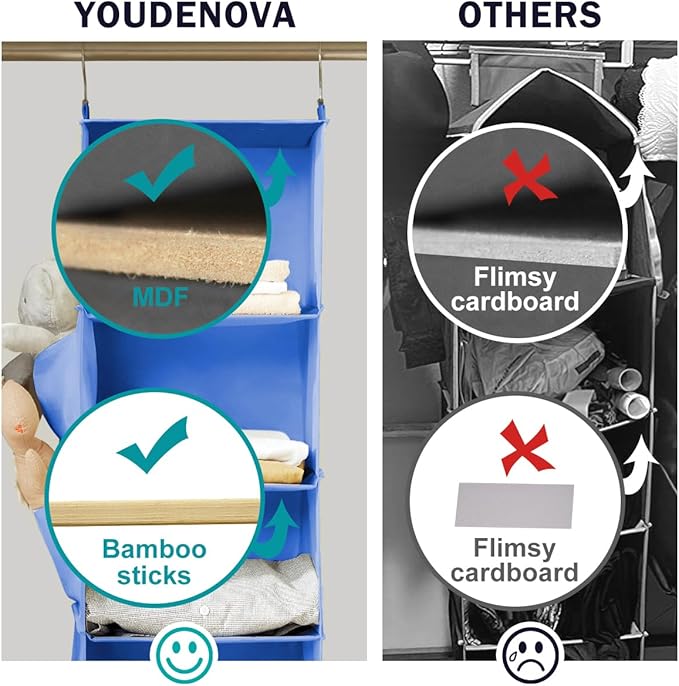 - HIGH QUALITY: This hanging closet organizer is made of sturdy and thick non-woven, built to last. Unlike some similar product, this one has 2 pcs sturdy bamboo inserts at each shelf and MDF board at top & bottom, which can avoid the compartments bending.
