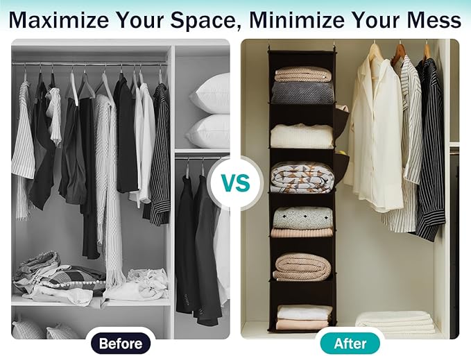 - SUITABLE: The closet hanging storage allows you to have more space in your closet. It has six shelves units. This shelf organizer is suit for people who need more storage, but they do not have space in their closet. Also, it is for people who want to use their space more efficiently.