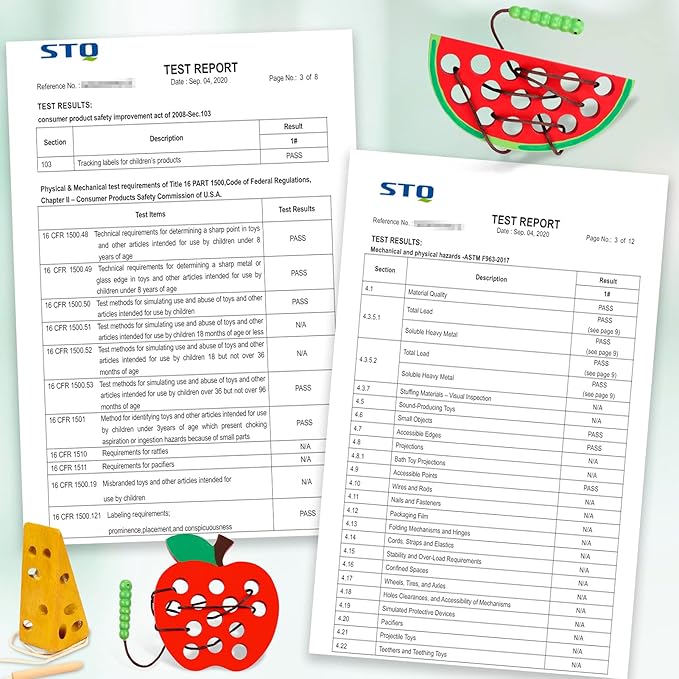 - SAFE FOR KIDS-Wood lacing toy that is made of beech wood with non toxic paint that is safe for your kids. The lacing toy is lead free and BPA free. It conforms to ASTM and CPSC standards. It does not have any chemical smell and the style of the fruits is realistic. The caterpillar can fit perfectly though the holes, it can easily be pulled and pushed. The string is also connected to the toy and both toys are very durable.