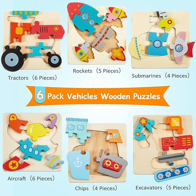 6 Pack Wooden Puzzles for Toddler 1-3 Years Old Wood Jigsaw Puzzles for Boys Montessori Games and Educational Toys for Kids Wooden Toddler Puzzles Present (Vehicle)