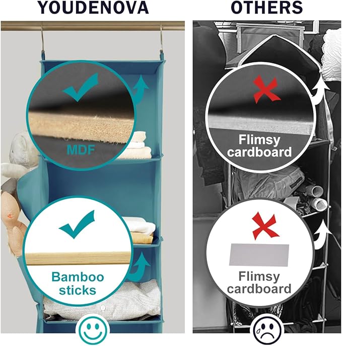 - HIGH QUALITY: This hanging closet organizer is made of sturdy and thick non-woven, built to last. Unlike some similar product, this one has 2 pcs sturdy bamboo inserts at each shelf and MDF board at top & bottom, which can avoid the compartments bending.