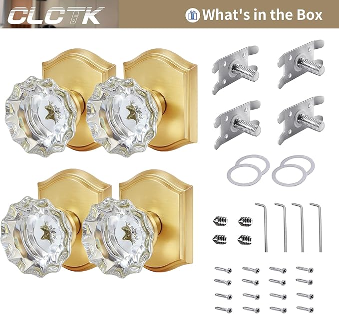 CLCTK 4 Pack Crystal Glass Dummy Door Knob, Single Side Dummy Door Knob Set for Interior Doors, Satin Brass