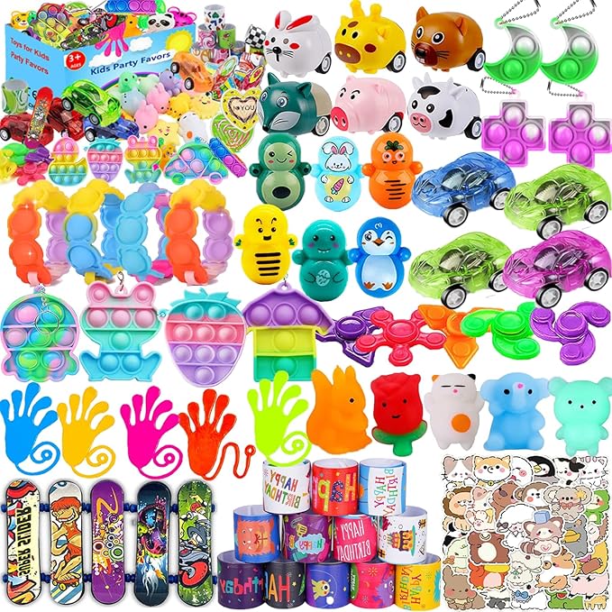 - 117 pack party favors toys set: 4 pop bracelets, 4 cute pop fidget toys, 4 mini pop keychains, 5 animal pull back cars, 5 mini skateboards, 5 pull back cars, 5 tumbler toys, 5 mochi squishy toys, 5 sticky hands, 5 spinners, 10 slap bracelets, 60 stickers. Total 117 Pcs Prizes Toys Bundle.