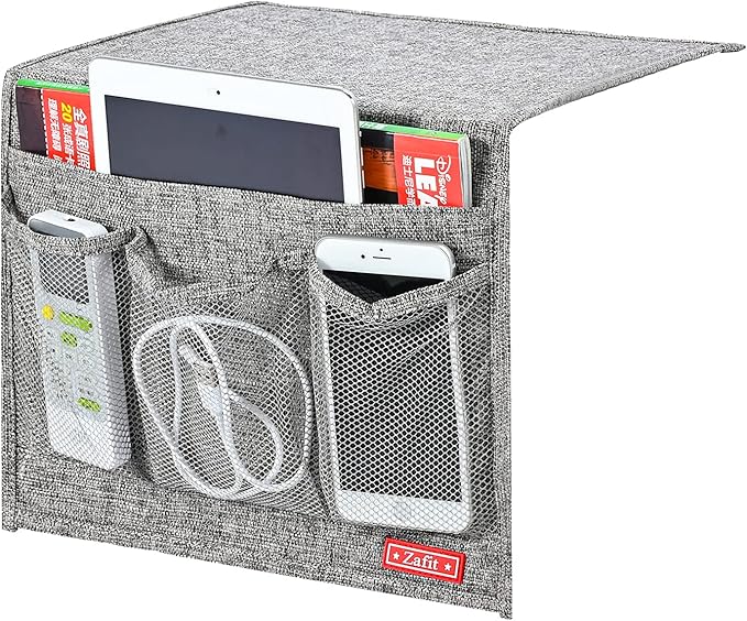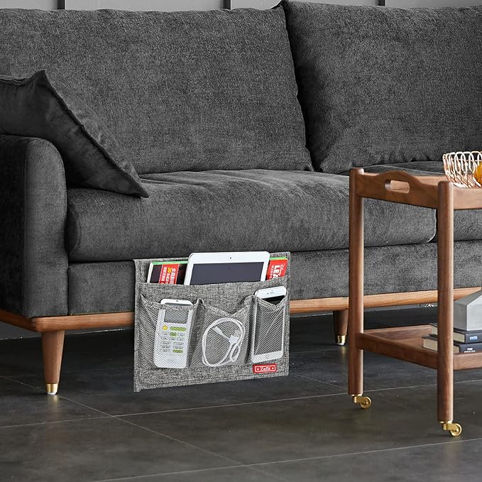 Zafit Linen 4 Pockets Bedside Caddy, Bedside Storage Organizer for Magazine, Remotes, Phone (Classic Grey)