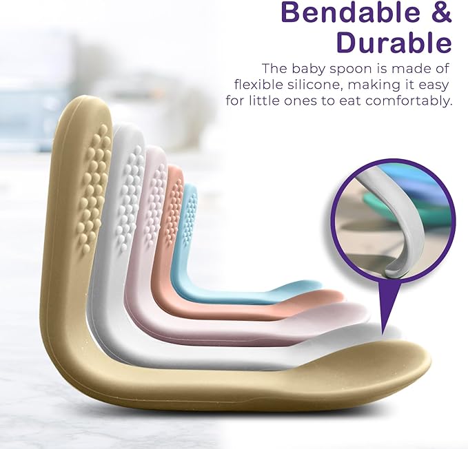 - Silicone Baby Spoons First Stage Pack of 5 - As your baby is transitioning to solids, these silicone spoons baby will aid in developing their skill of self-feeding and at the same time sharpening their motor skills, the silicone baby spoon is designed with those tiny hands in mind, so it should be easy to grasp and soft to touch. Choose these Silicone Baby Spoons self feeding 6 months to empower your baby's developmental milestones with confidence and comfort.