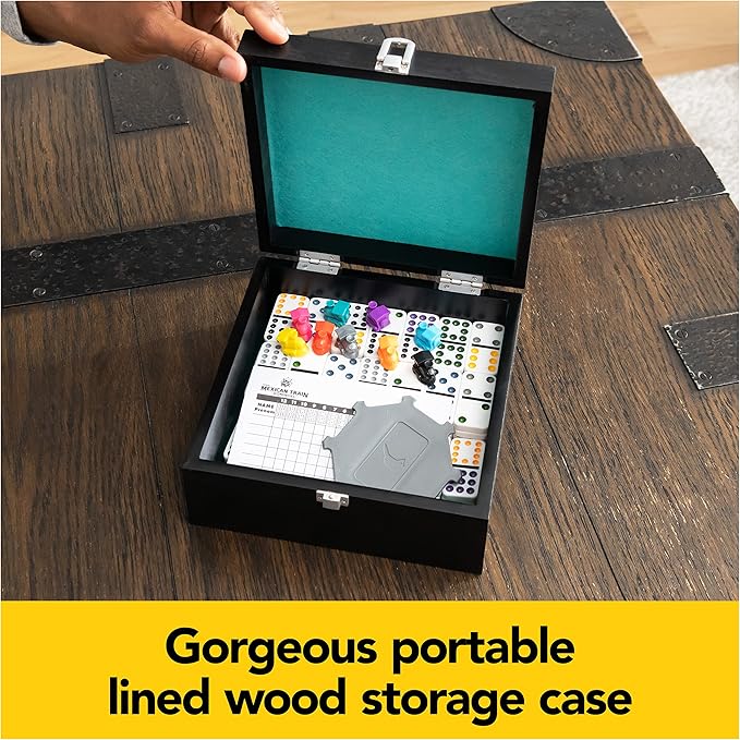 - PORTABLE LINED WOOD CASE: Take your dominoes with you anywhere in this gorgeous wooden case that will protect your dominoes to keep them looking pristine. You can rely on these dominoes and train movers to stand the test of time.