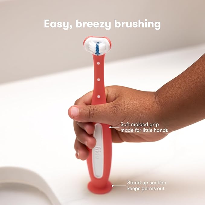 Frida Baby Triple-Angle Toothhugger Training Toddler Toothbrush | Toddler Toothbrush 2 Years and Up, Cleans All Sides at Once | 2 Pack (Pink + Blue)