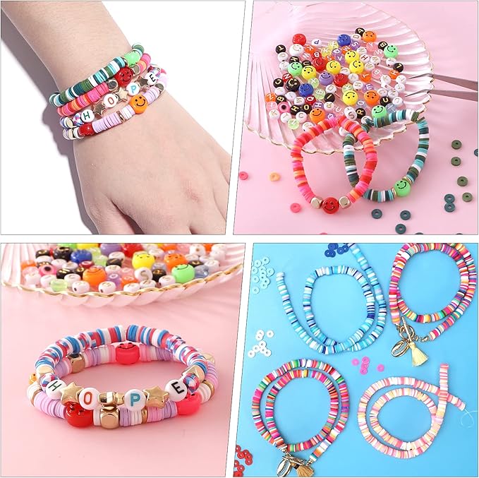 - 【VALUE CLAY BEAD KIT】: The clay beads for bracelets making kit includes 24-color flat round soft clay beads (200pcs each color), letter beads in 4 types of colors (100pcs each color), 100pcs smiley face beads, 100pcs pearl beads, 50pcs gold spacers, 20pcs square beads, 20pcs star beads, 5pcs metal conch, 20pcs lobster clasp, 100pcs jumping circle, 50pcs binders, 4 color elastic ropes, 1 small scissors,1 tweezers and 1 plastic storage box.