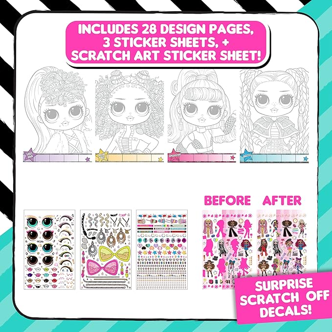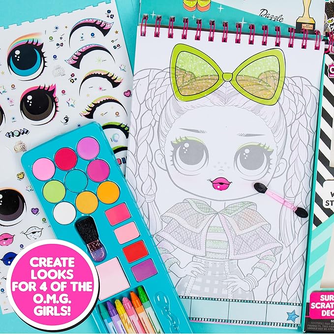 - SET INCLUDES: 1 Spiral-Bound L.O.L. Surprise! O.M.G. Make-Up Artist Magazine (10.5 in. x 10.9 in.), 6 Glitter Crayons (1 Teal, 1 Pink, 1 Green, 1 Purple, 1 Yellow, 1 Orange), 4 Stencil Sheets, 3 Repositionable Sticker Sheets, 1 Repositionable Scratch Art Sticker Sheet, 4 Magazine Pages, 28 Printed Coloring Pages, 9 Eyeshadow Cakes (Light Pink, Pink, Purple, Gold Glitter, Green, Orange, Purple, Teal, White Iridescent), 4 Lip Glosses (Pink, Purple, Red), 1 Pink Blush Cake, 1 Eyeshadow Brush, 1 Cosmetic Brush