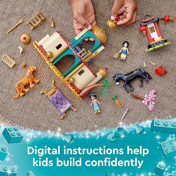 - Includes Disney’s Princess Jasmine and Mulan mini doll figures, plus Khan the toy horse, Rajah the tiger LEGO animal figures