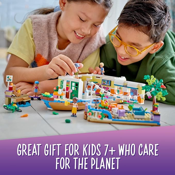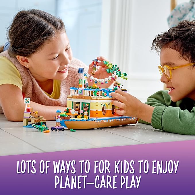 - Retro-styled eco-houseboat model – Let kids live out an environmentally friendly lifestyle aboard the LEGO Friends Canal Houseboat (41702), which comes with a deck-top market garden