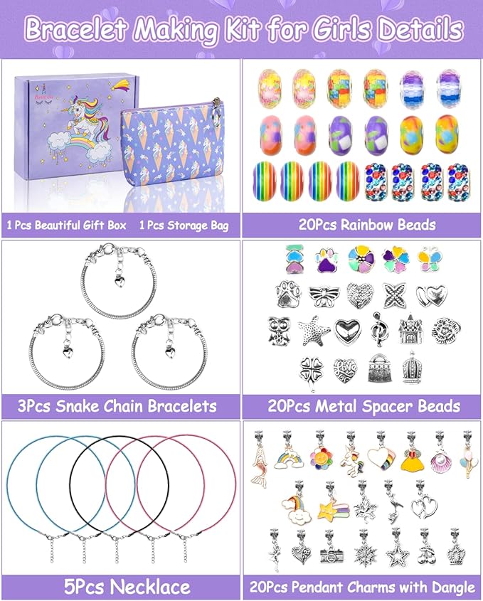 - 🎀【What You Get】The Anicco 70PCS bracelet making kit for girls comes with 1 Pcs Beautiful Gift Box,1 Pcs Storage Bag,5Pcs Necklace,3Pcs Snake Chain Bracelets,20Pcs Metal Spacer Beads, 20Pcs Pendant Charms with Dangle,20Pcs Rainbow Beads. The jewelry making kit is perfect for girls DIY crafts.