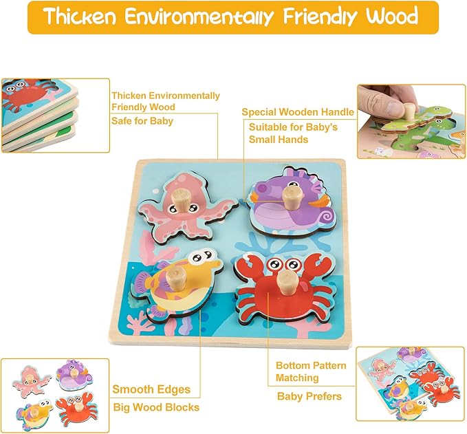 - Durable and with Handle - Our wooden puzzles are made of thickened wood, so it is hard and not easy to deform or crack, very durable, and your baby can enjoy it for a long time. The size of each puzzle is 5.9 x 5.9 x 0.2 inches, and each wooden block has a handle, which is more convenient for the baby's small hands to hold