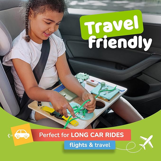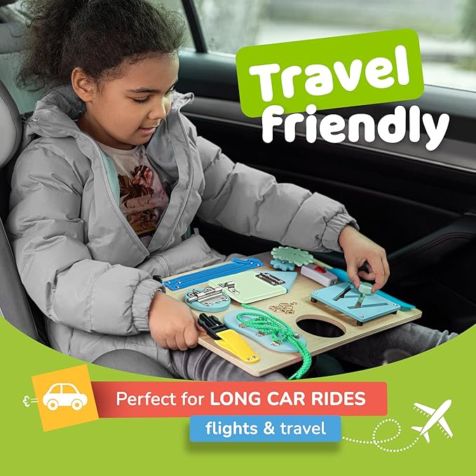 - Travel busy board for kids - A perfect travel toy for toddler activities, this toddler busy board provides car activities for kids and airplane activities, keeping children entertained on long journeys. Weighing just 2 pounds, it’s easy to carry and packed with sensory challenges for screen-free learning.