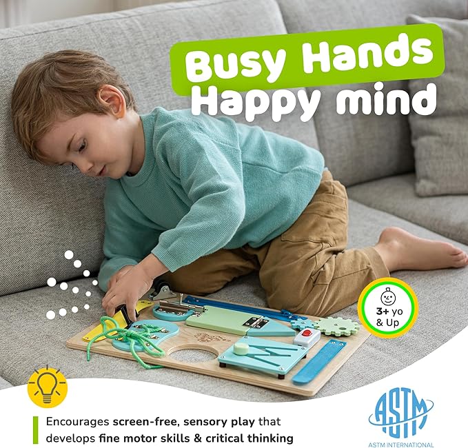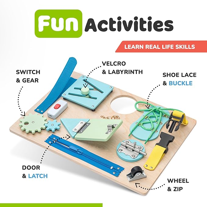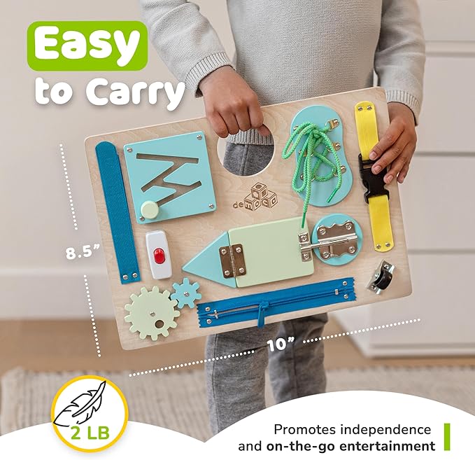- Wooden Montessori busy board - Educational toy for toddlers, this montessori busy board for toddlers is a sensory busy board with 10 fun activities that support fine motor skills, problem-solving, and cognitive growth. Perfect for preschool learning and toddler activities at home or on the go.