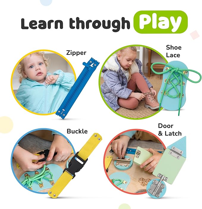 - Activity board for toddlers - deMoca Wooden Toy is a Montessori toddler toy with colorful wooden pieces. This basic skills activity board features a zipper, buckles, and a shoe-tying kit that lets kids practice, fostering independent dressing skills and coordination.