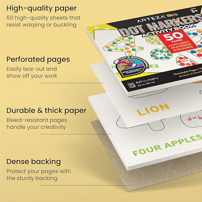 Arteza Kids Dot Markers and Activity Book, 6 Nontoxic Bingo Daubers, 50-Page Book