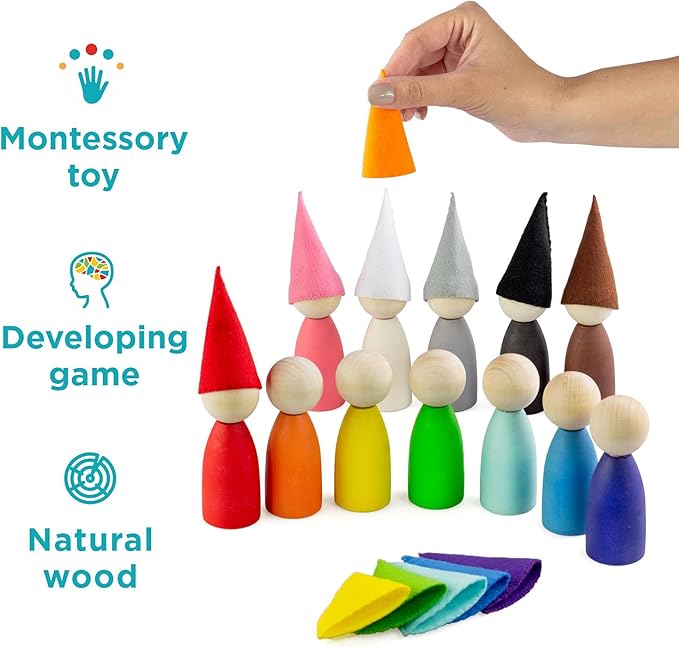 - 📜 INCLUDED: 12 colored wooden peg dolls 3.35 in; 12 felt sorting hats; a wooden tray to keep all in place in your Montessori room; Combines with our sorters with cups and balls, spoons, smaller Montessori dolls, building blocks, and others