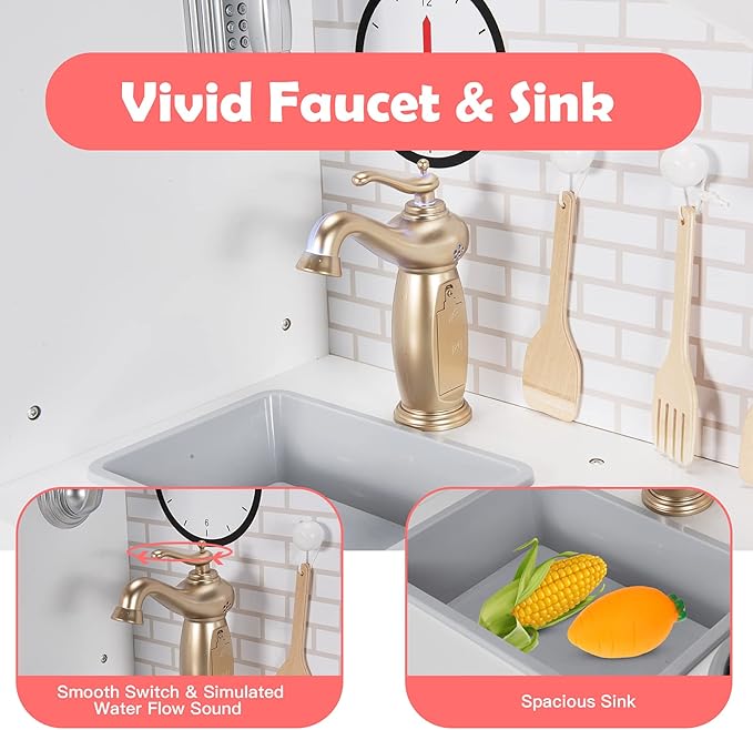 - Realistic Kitchen Experience: With vivid appearance and simulated sound of stove switch and faucet, this kitchen playset will provide a realistic kitchen experience for your little one. And other playable features like telephone, clock, oven and sink will offer much more fun as well as enhance kid’s imagination.