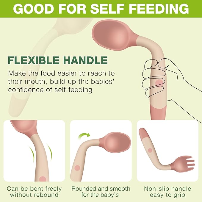 - Good for Self Feeding: this toddler fork and spoon set can be curved, they can be bent left or right or bent forward 90 degrees without rebounding, good for babies to learn to feed by themselves, brings baby with fun and interesting of learning to eat independently, helps those who have struggled with utensils, help them to hold food better, make the food easier to reach to their mouth, build up the babies' confidence of self-feeding