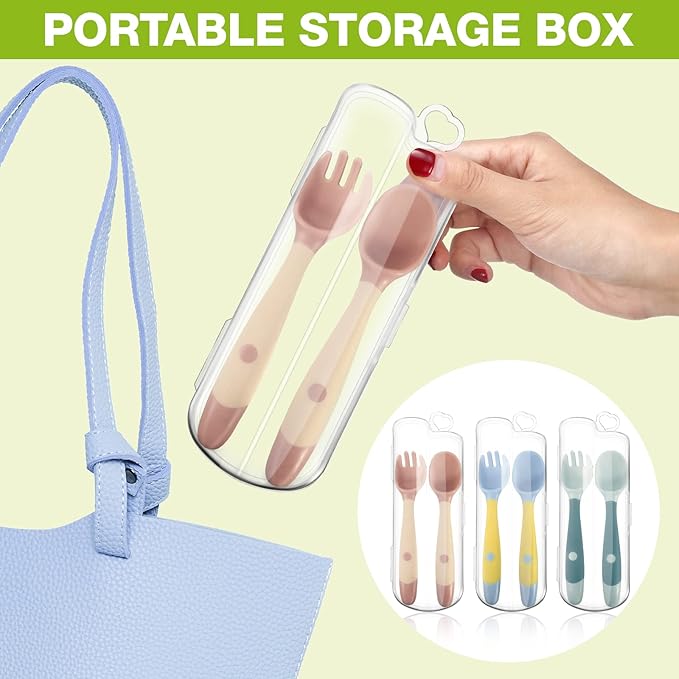 - toddler utensils baby spoon fork set travel case silicone self feeding training kids bendable handle silverware 12 18 months first holder cutlery rubber carrying storage beginner grip heat resistant safe