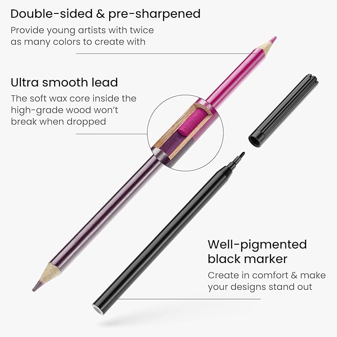 - Set Includes 12 Double-Ended Colored Pencils: Our doodle book also includes colored pencils for kids, one pencil sharpener, one eraser, and one black marker.