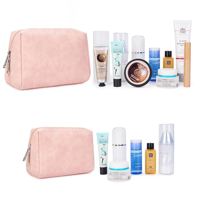 2 Pack Vegan Leather Makeup Bag Zipper Pouch Travel Cosmetic Organizer for Women (Large (Pack of 2), Orange Pink)
