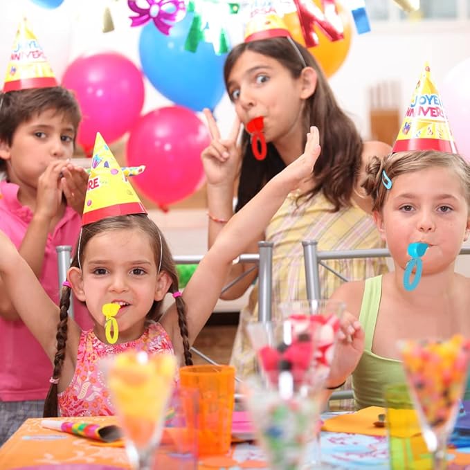 - PREMIUM DESIGN: A whistle that will make the next event memorable! Our kids’ party noisemakers are made of high-quality plastic that is durable and sturdy to use. The whistle measures 2’’ and the sound is loud and clear.