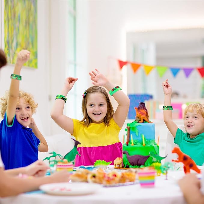 - Suitable Size: each dinosaur wristband is approx. 6.4 cm/ 2.5 inches in diameter, 1.2 cm/ 0.5 inch in width and 20 cm/ 7.9 inches in circumference, with the stretchy feature, it can fit most people without pinching, tugging or snapping, making it ideal for jungle dinosaur themed birthday party and baby shower