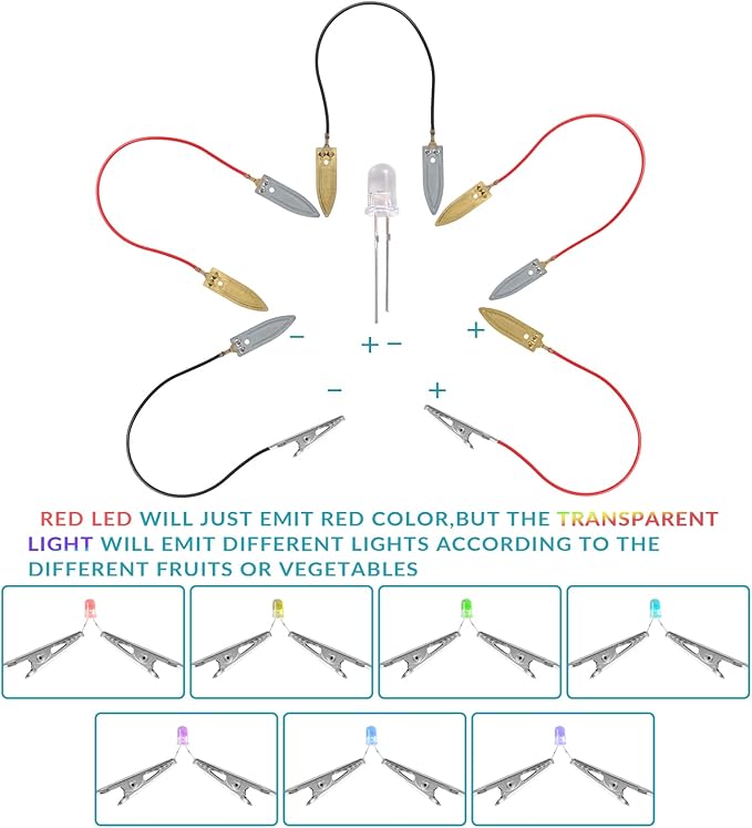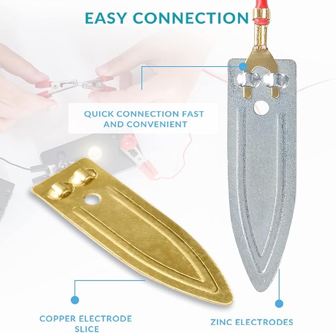 - Easy to Operate: It is easy to use in scientific projects. Before experiment , you only need to prepare lemons, apples or some vegetables and beverages to assemble the battery. We provide simple experimental ideas. Please kindly see the circuit combination on our pictures and avoid short circuit