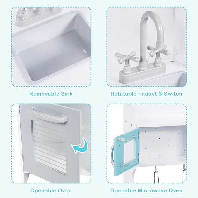 • 🍽️【Quality & Child-friendly Material】: Made of premium child-friendly MDF that has passed ASTM certification, this kids kitchen is odor-free and durable for long time use. And the solid wood legs provide strong support, preventing suddenly turnover, which is safer for your kids to use.