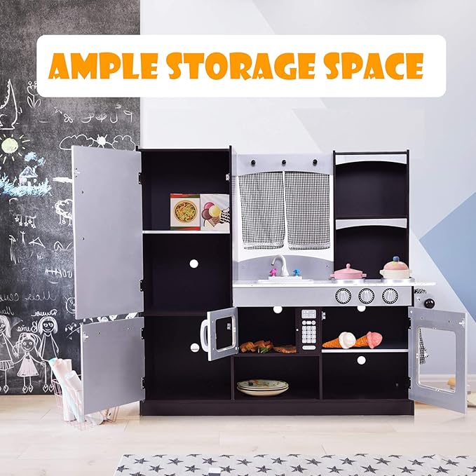 - 🥧【Large Built-in Storage Space】: Featuring multiple storage places including an oven, a refrigerator, a 2-tier open shelf and large cabinets, your kids can store all the food and kitchen accessories in them. Moreover, this kitchen play set also helps develop good habits and keep the play area neat.